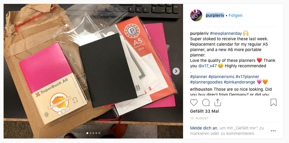 „Super stoked to receive these last week. Replacement calender for my regular A5 planner and a new A6 more portable planner. Love the quality of these planners.“ (Link)