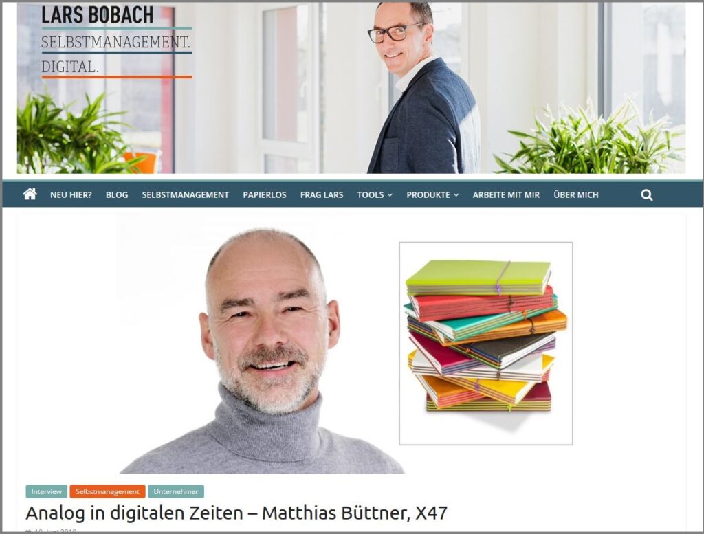 Lars Bobach ist ein erfolgreicher Blogger, der über „Selbstmanagement – digital“ bloggt. Er ist Fachmann für Tools und Gadgets in diesem Bereich, aber auch offen für alternative Verfahren, so auch für X17 und X47.
