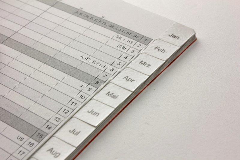 Die Produktion von Monatsplanern ist sehr aufwendig, daher werden diese als Heft später ausgeliefert. Nach dem Layouten und Prüfen der Daten (immerhin für 3 Jahre(!)) muss das Heft produziert werden. Anders als bei den Tages- und Wochenkalendern braucht der Monatskalender aber noch eine Registerstanzung inkl. Lackierung.