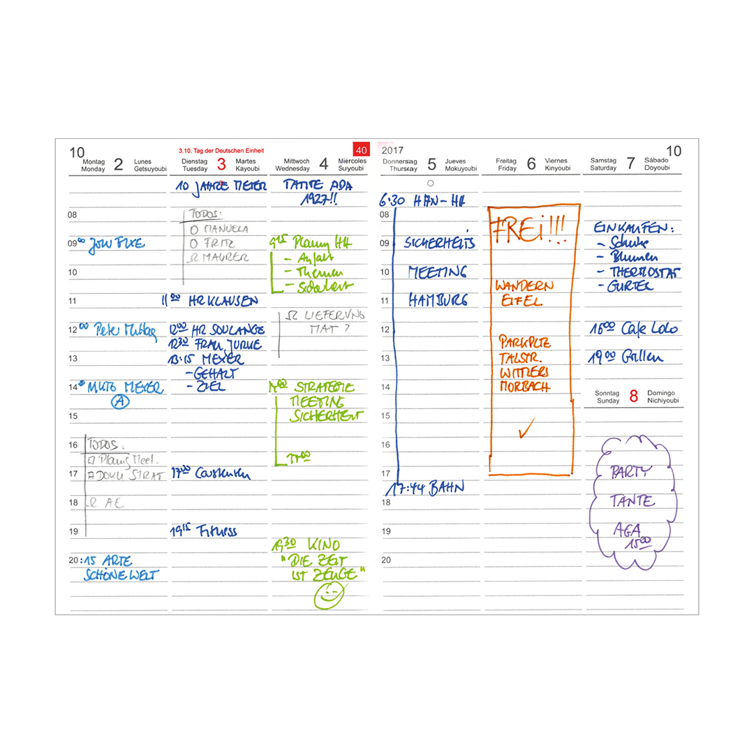 Der Wochenkalender „classic plus“ ist für Menschen mit vielen Terminen pro Tag. Die senkrechten Zeitspalten laufen von oben bis unten auf der Seite. Der Nachteil: Kein Platz für tagesübergreifende Aufgabenlisten.